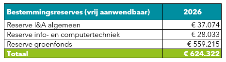 Indien er bestemmingsreserves zijn waarbij de raad nog vrij kan besluiten over de bestemming van het geld én de rente wordt niet als dekkingsmiddel voor de exploitatie ingezet. Deze vrij aanwendbare bestemmingsreserves omvatten de volgende (stand 1-1-2026):