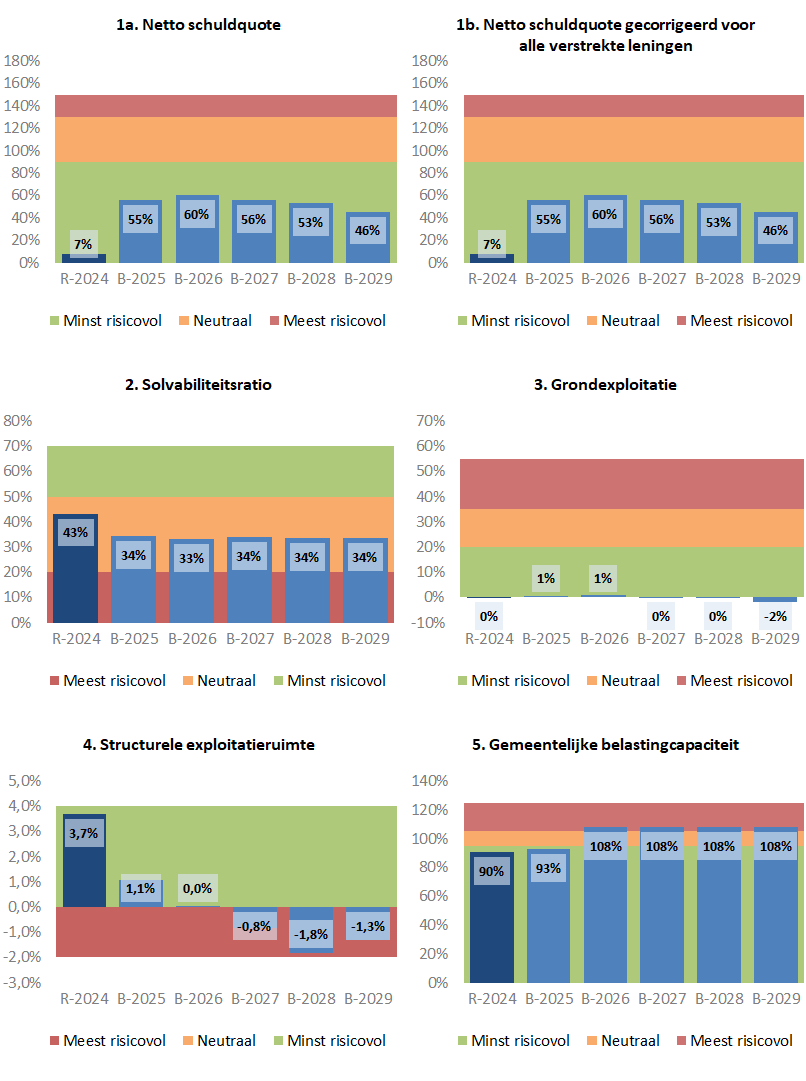 Op basis van de bovenstaande kengetallen kan de conclusie getrokken worden dat de financiële positie van de gemeente steeds verder onder druk komt te staan. De structurele exploitatieruimte zakt vanaf 2027 ver onder de 0% conform de meerjarenbegroting die vanaf 2027 een negatief saldo laat zien. De solvabiliteitsratio blijft wel stabiel en blijft voorlopig nog boven de kritische zone van 20%.