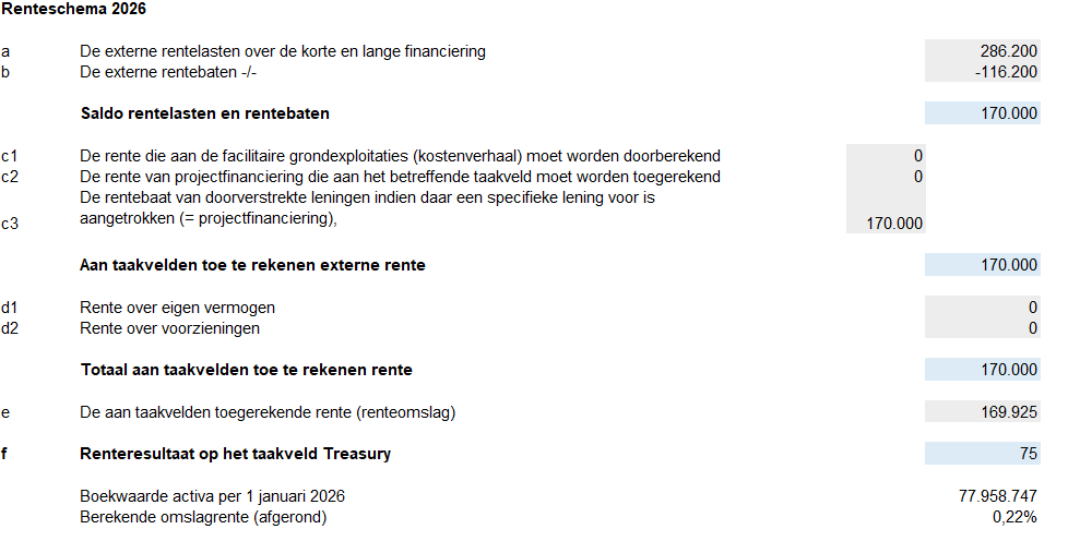 Binnen de gemeente wordt het principe van totaalfinanciering toegepast waarbij er geen verband bestaat tussen de financiering en verkregen activa. In de basis worden alle rente baten en lasten binnen het taakveld treasury vastgelegd alvorens het saldo van de rentebaten en rentelasten worden toegedeeld aan de taakvelden middels de omslag rente (afgerond 0,22%). Hieronder de voorschreven tabel voor 2026 waaruit het begrote renteresultaat blijkt.